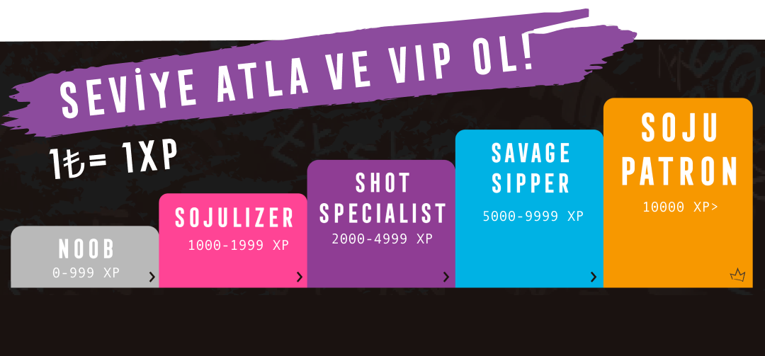 SojuBar'da harcadığınız her 1 TL için 1 XP kazanırsınız. XP'niz arttıkça seviyeniz yükselir ve restoranlarda Soju puan fırsatlarından faydalanırsınız. Programda toplam 5 seviye bulunur. Noob, Sojulizer, Shot Specialist, Savage Sipper ve Soju Patron. Yeterince XP topladığınızda sistem sizi otomatik olarak bir üst seviyeye taşır ve tüm restoran harcamalarınızda %10' a varan Soju puandan yararlanabilirsiniz! SEVIYE ATLA VE VIP OL | |